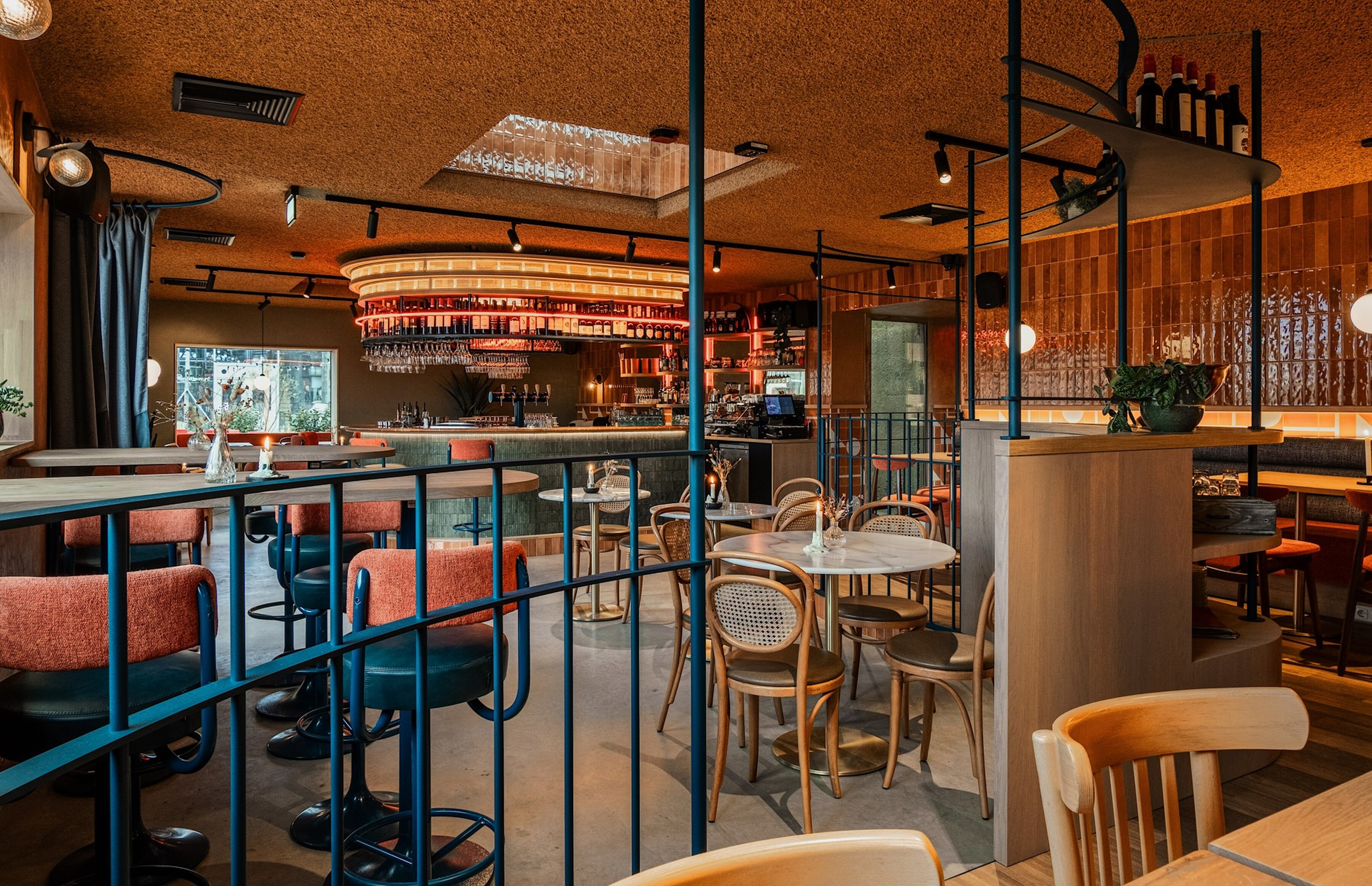 Het is op het begin wat zoeken op het industriële terrein. Maar als je het eenmaal vindt dan beland je in een interieur gehuld in terracotta, zeegroen en rivierblauwe tinten. Het terras kijkt uit op het Waalplein en de Oversteek. Het contrast tussen binnen en buiten is enorm. Buiten is het rauw en industrieel. “Maar binnen voelt het als een warme deken, zei een gast laatst.”Plek voor ondernemers